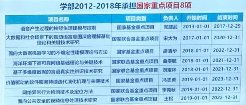 我们学部这几年发展是非常迅速的。从16年到18年,我们承担了四项国家重点研发计划,比如健康养老快捷服务试利用示范项目,社区风险监测与防范关键技术研究项目,产品自适应、在线设计、技术平台、研发项目等。除了这些重点研发项目之外,我们还承担了多项国家基金重点项目,比如网络异常行为检测项目,大数据、机器学习项目,语音机理研究项目,可靠网络基础研究项目等。这两年,我们在科研领域取得了比较大的突破,在学校属于快速发展的学部。