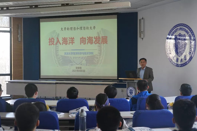 参加游学体验的同学们,更是有机会在现场聆听了海洋科学与技术学院张安民教授的科普报告《投入海洋 向海发展》。讲座共分为五个部分:认识海洋、经略海洋、智慧海洋、向海发展、投入海洋。张教授亲切地为同学们科普了海洋的基本常识,让同学们认识到海洋资源的丰富及其重要性,并从历史角度论述了“海洋强则国家强”的硬道理,介绍了我国海洋的发展战略;此外,张教授还从学科角度出发阐述了海洋科技的发展情况,又联系当今经济形势说明了海洋经济在中国经济中的重要地位。在报告最后,张教授向大家介绍了天津大学与海洋学院,表达了对同学们报考天津大学的欢迎。讲座结束后,同学们积极的和张教授进行互动交流,报告现场氛围十分热烈。