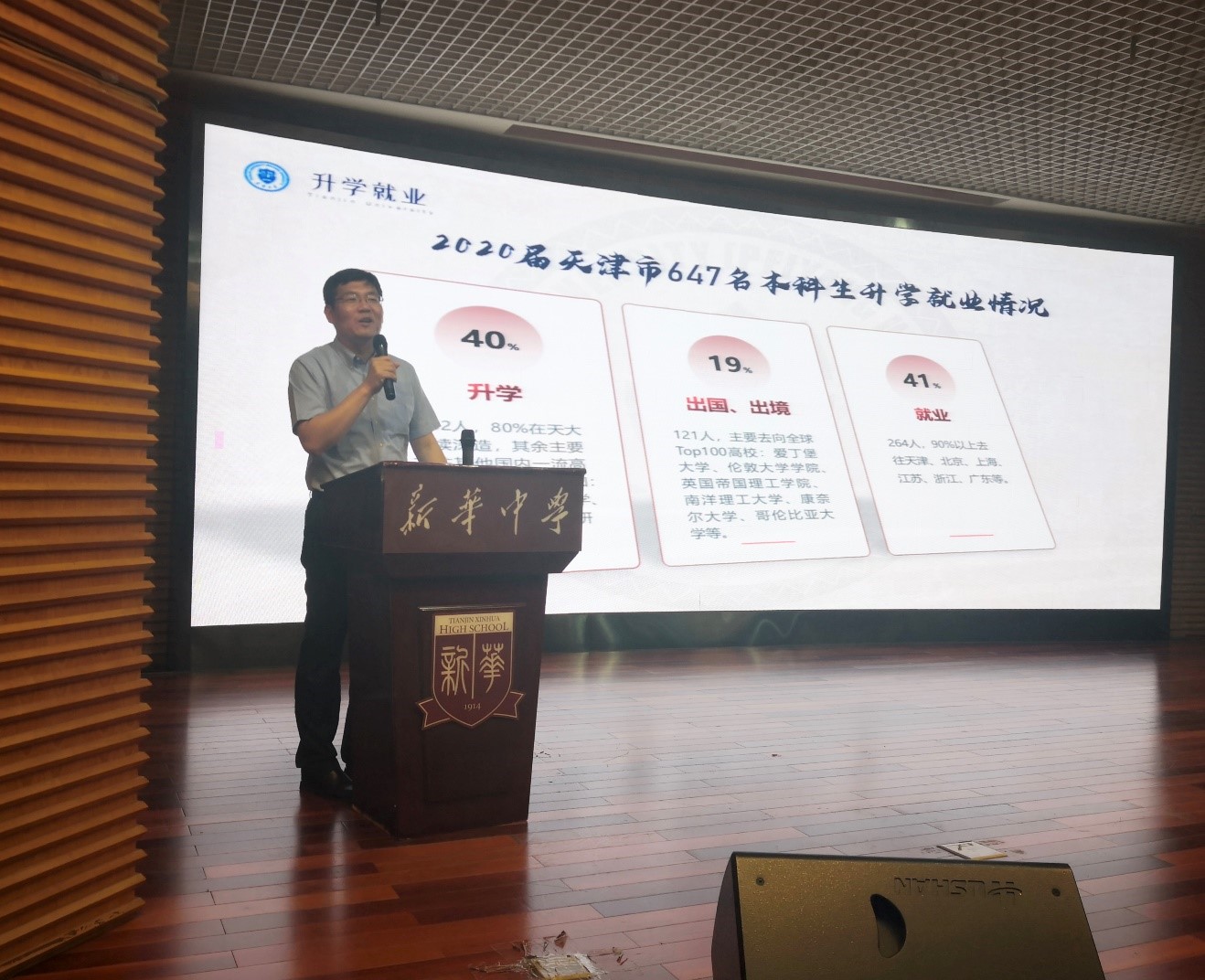贾启君在新华中学向考生家长重点介绍了天津大学在津录取情况和最新招生政策。他指出,作为在津投放招生计划最多的双一流高校,天津大学结合天津市产业发展需求优化专业投放,结合考生需求精准咨询,量身定制优惠政策。他向考生们发出诚挚邀请,欢迎更多的优秀学子报考天津大学,启航天大梦想,成就精彩人生。