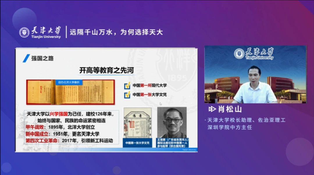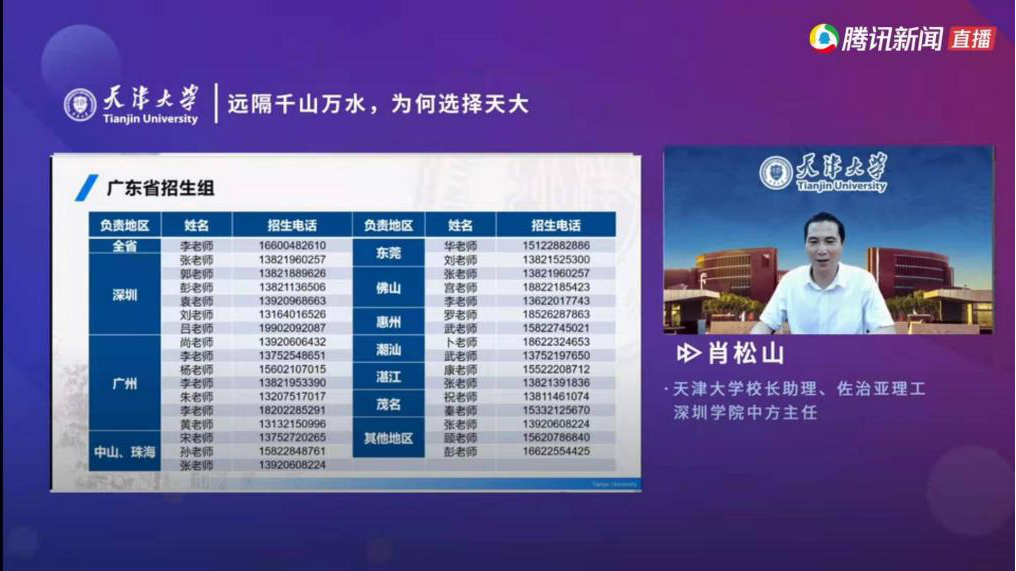 6月23日,天津大学广东招生组以线上直播的方式举办2021年广东省首场高考季招生宣讲会。天津大学校长助理、佐治亚理工深圳学院中方主任肖松山老师以《远隔千山万水,为何要选择天大?》为主题,向广东省高考考生及家长们介绍天津大学并讲解招生政策。
