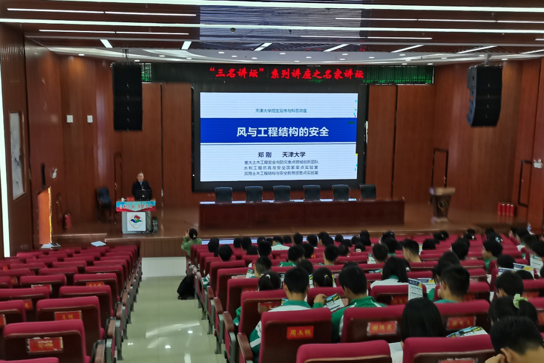 郑刚首先为同学们带来题目为《风与工程结构的安全》的科普讲座,从振型、涡旋与卡门涡街、涡旋脱落、涡激振动、共振五个概念出发,结合生活中的实例向大家深入浅出地介绍了风在日常生活中对工程结构的影响。随后,他介绍了天津大学悠久的历史和深厚的文化底蕴,展示了领先的育人理念、卓越的成长平台、杰出的校友以及雄厚的科研实力。并发出诚挚邀请,欢迎同学们报考天大,一起成为天大人,传承天大品格。