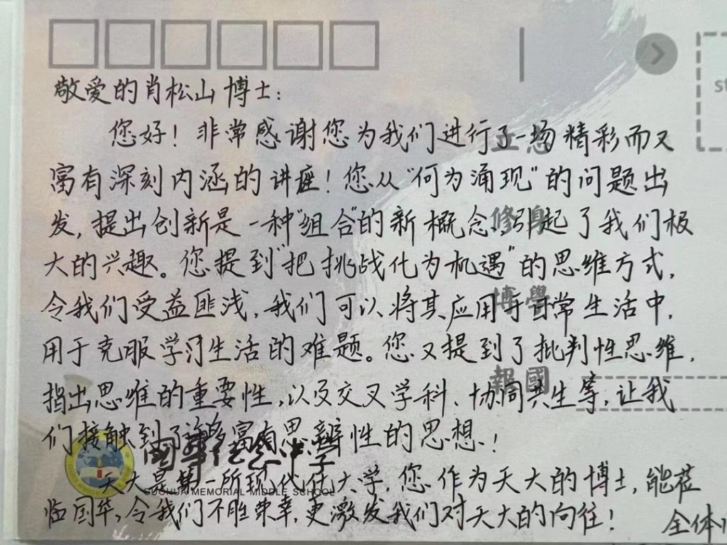 报告结束后,同学们跟肖松山老师进行了交流并为他送上感谢卡片。同学们表示这场科普报告为他们打开了视野,接触到了许多富有思辨性的思想,令同学们受益匪浅,在未来的学习中,他们将从多角度出发,着力培养自身的创新意识与创新能力,为早日成长为国家社会主义现代化建设中所需的创新型人才而不懈奋斗。