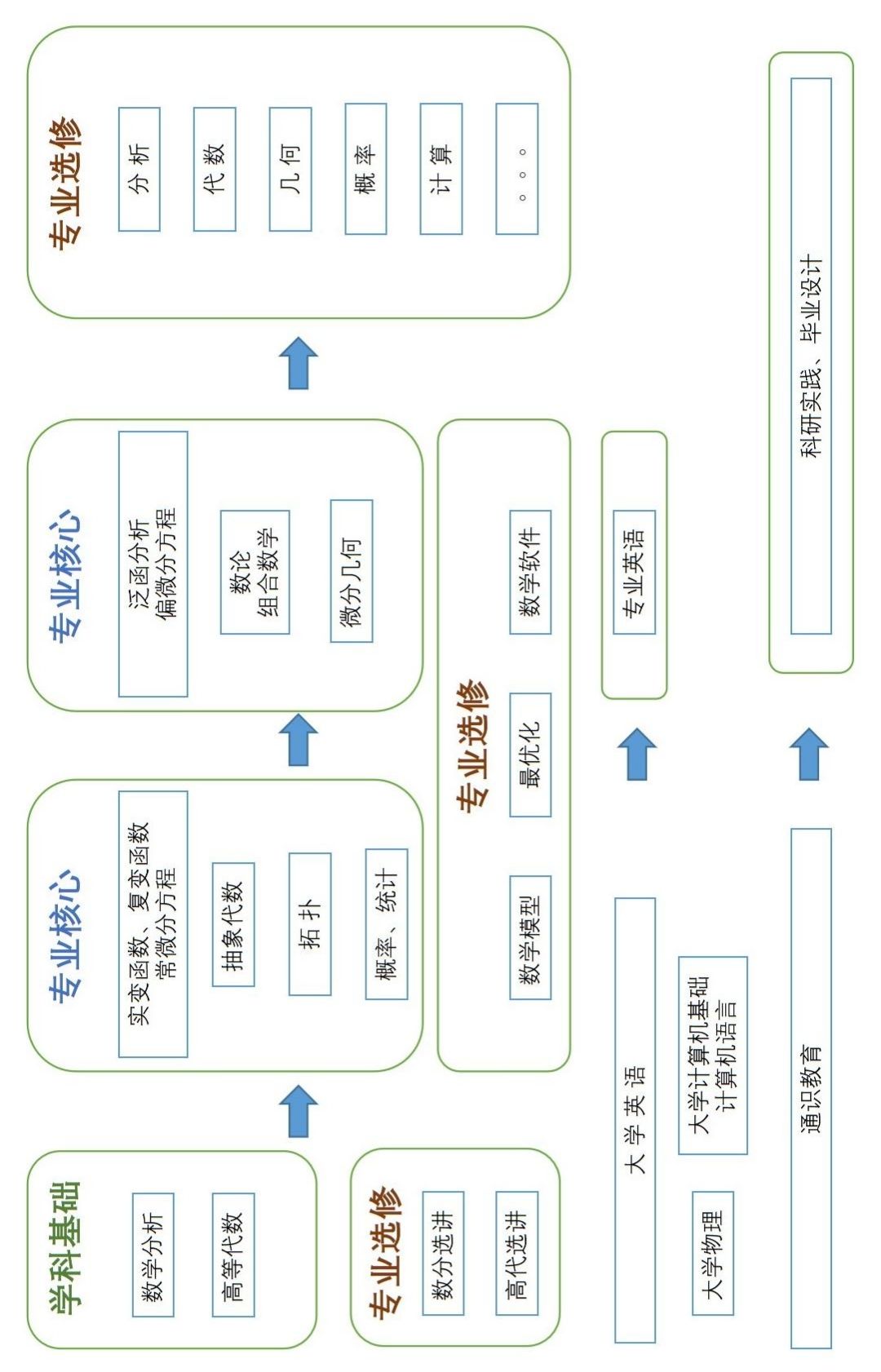 数学分析、高等代数、抽象代数、实变函数、泛函分析、复变函数、概率论、数理统计、常微分方程、偏微分方程、数论选讲、拓扑学、微分几何。