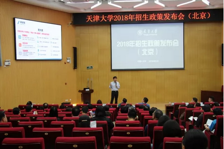 5月13日,天津大学2018年招生政策发布会(北京)在北京召开,首次在全国范围内以分省形式开启今年招生政策的发布之旅,旨在以发布会形式,让更多的目标考生、家长能够直接与学校招办、各省市招生组教师面对面交流,将我校的招生新政了解全、细、透、准。本次活动由天津大学招生办公室、海洋学院、北京招生宣传组、北京校友会共同举办,海洋学院院长翟京生,教务处副处长、招办李斌,海洋学院副院长巩乐,北京校友会副会长兼秘书长冯国馨,北京校友会副秘书长刘若沁、田佳欣、陈刚等校友出席,北京招生宣传组组长潘晓睿主持活动。