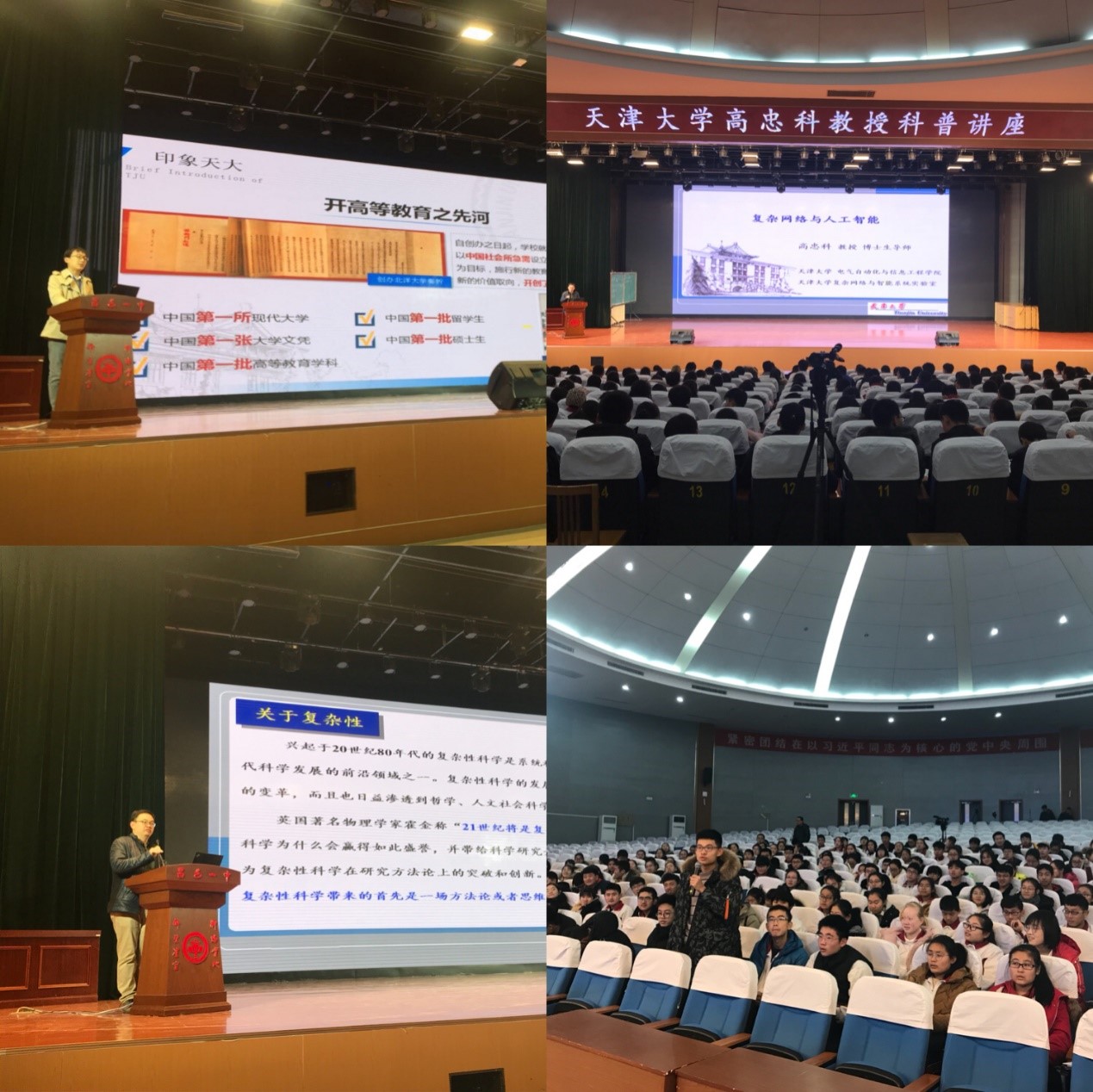 12月16日,高忠科、杨洪涛前往昌邑一中作招生宣传,初中九年级全体同学、部分高中同学和学生班主任参加了活动,活动由王银磊副校长主持。杨洪涛首先通过《天津一分钟》微视频向全体师生介绍了天津的概况,随后通过延时摄影、招生宣传PPT介绍了天津大学的基本情况,欢迎优秀学子报考天津大学。高忠科教授做了题为《复杂网络与人工智能》的科普讲座,从中学生能够理解的视角说明了什么叫做复杂网络,阐述了人工智能在现实生活中的应用、人工智能的发展方向以及目前为止世界范围内人工智能的整体水平。着重讲解了我国在复杂网络和人工智能领域所处的位置,天津大学在复杂网络和人工智能领域研究的最新成果。昌邑一中自招办主任阎昭斐组织学生提问环节,讲座过程中同学们踊跃提问,气氛热烈。