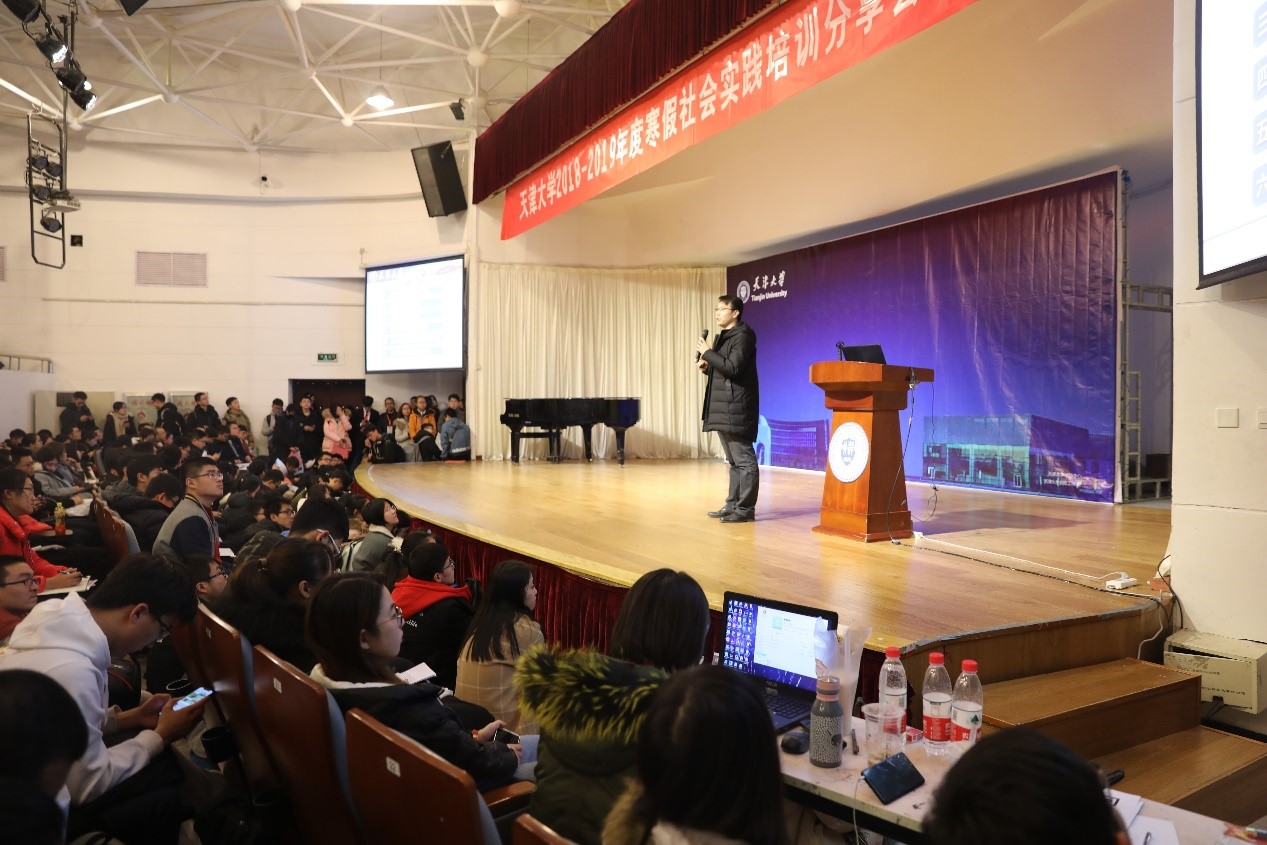 回访母校实践培训会分别于北洋园校区求实会堂与卫津路校区大学生活动中心举办。在培训会现场,来自近800支实践队的3000余名成员汇集于两个会场,在天津大学招生办公室郑志翔老师的讲解下,共同对招生基础知识与天津大学招生政策进行了一次全面细致的学习。