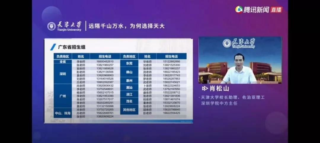 6月23日,校长助理肖松山在广东省深圳市通过腾讯新闻网络平台,以《远隔千山万水,为何要选择天大》为主题,向广东省考生及家长介绍天津大学并讲解招生政策,参与直播互动人数超过80万。