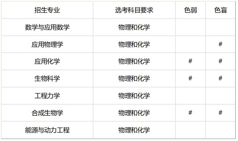 我校招生专业包括数学与应用数学、应用物理学、应用化学、生物科学、工程力学、合成生物学、能源与动力工程。所有招生专业在非高考改革省份招收理科考生,在高考改革省份选考科目要求见下表: