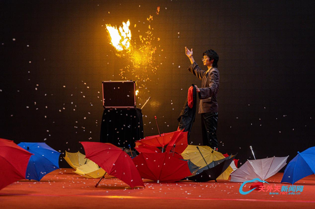 随着大幕的拉开,魔术师杨帆带来了娴熟流畅的出伞魔术。每一次转身,引起一阵惊呼;每一次挥手,幻化一把雨伞。在漫天飞伞中,杨帆结束了他的开场表演,将现场迅速带入了极其热烈的气氛。