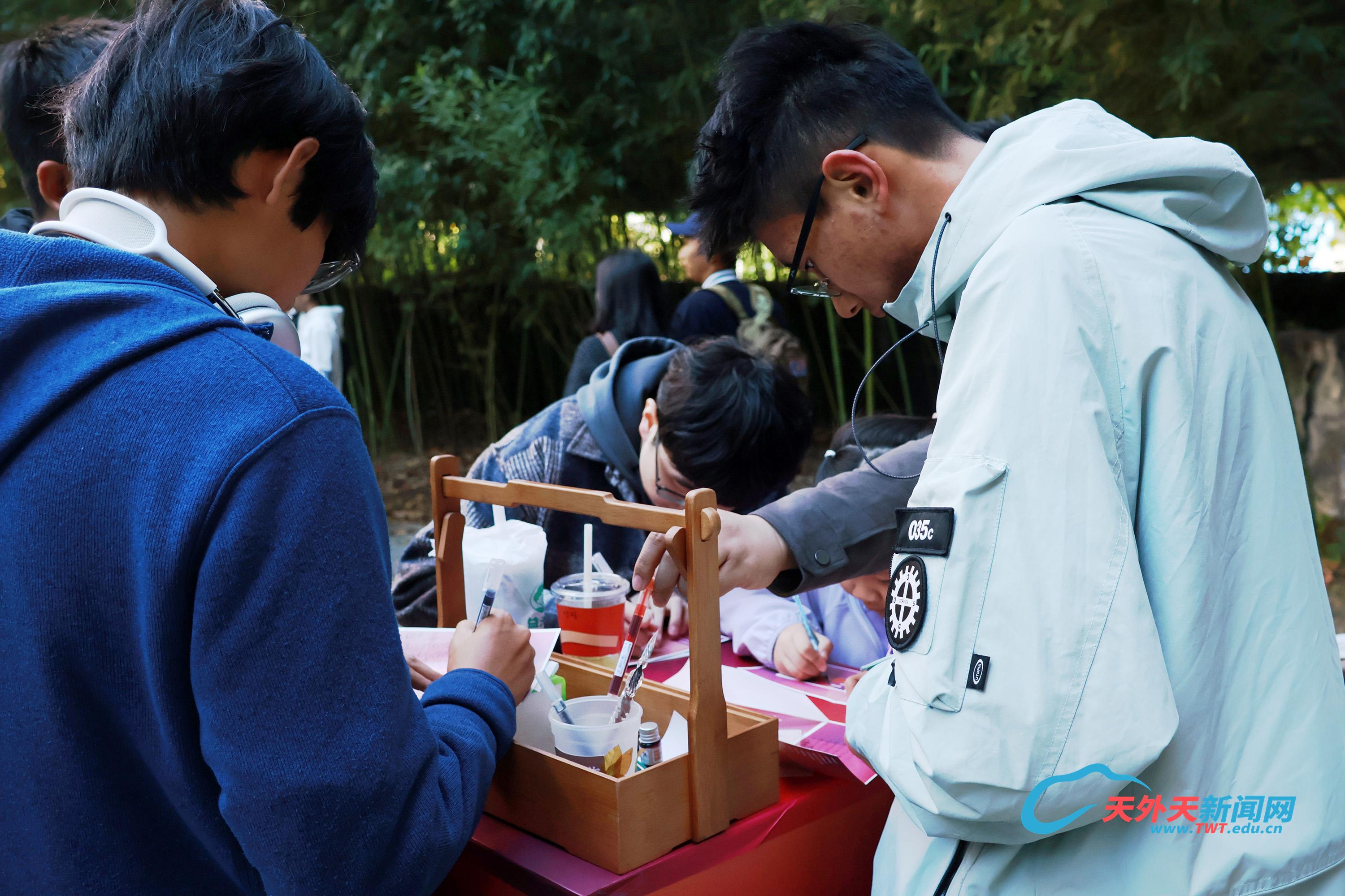 向左移步,有许多的同学正在写信,寄给未来的自己,表达了自己对未来的期望,串联起时空;在小池的另一边,有许多同学制作着红叶手工艺品,将秋天的色彩和创意融入其中。在红叶诗画廊,还有着许多照片和诗歌,大家用着热情表达了对艺术的热爱。