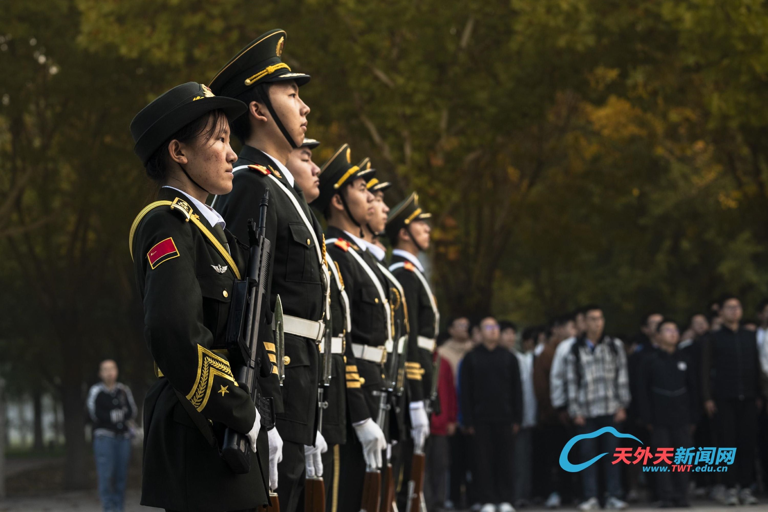 外国语学院江欣潞同学作为主持人致开场词,随后仪式正式开始。国旗护卫队先走齐步,再变正步向前迈进,护送国旗至旗杆下。他们一小时前便已开始候场,展现出对仪式的郑重。